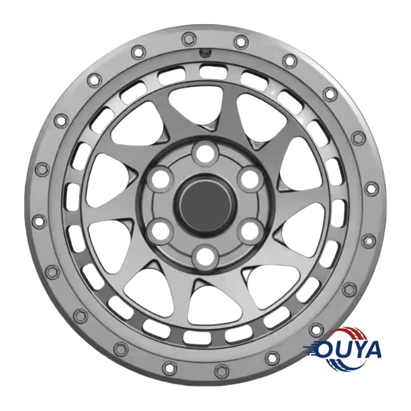 This 17-inch alloy wheel draws inspiration from aggressive off-road styles, featuring a rugged beadlock-look lip and a bold multi-spoke pattern. Its matte grey finish enhances both durability and visual impact, making it ideal for pickups, SUVs, and 4×4 builds. Designed for tough terrains and urban presence alike. Custom colors and bolt patterns are available.